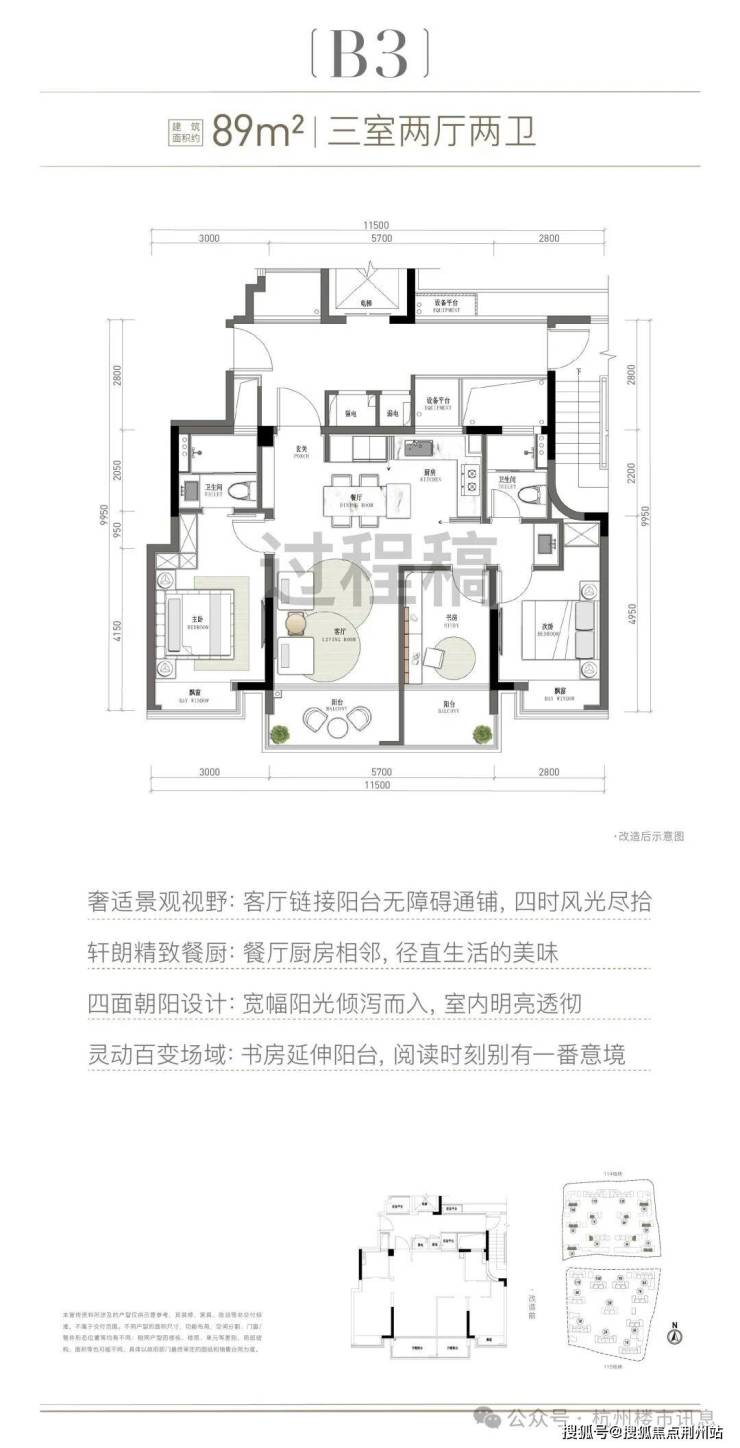 市场爆款建筑面积约89m²神户型,四开间朝南、约11.5米南向面宽、约18.5m²豪华主卧,三室两厅两卫格局,91%高得房率,舒适度堪比100方空间。