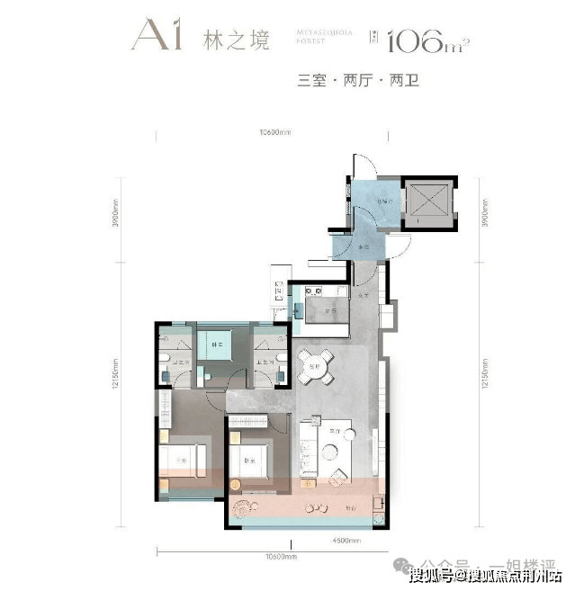 建面约106平三房两卫:超10米南向面宽!约4.5米开间的大横厅是亮点。