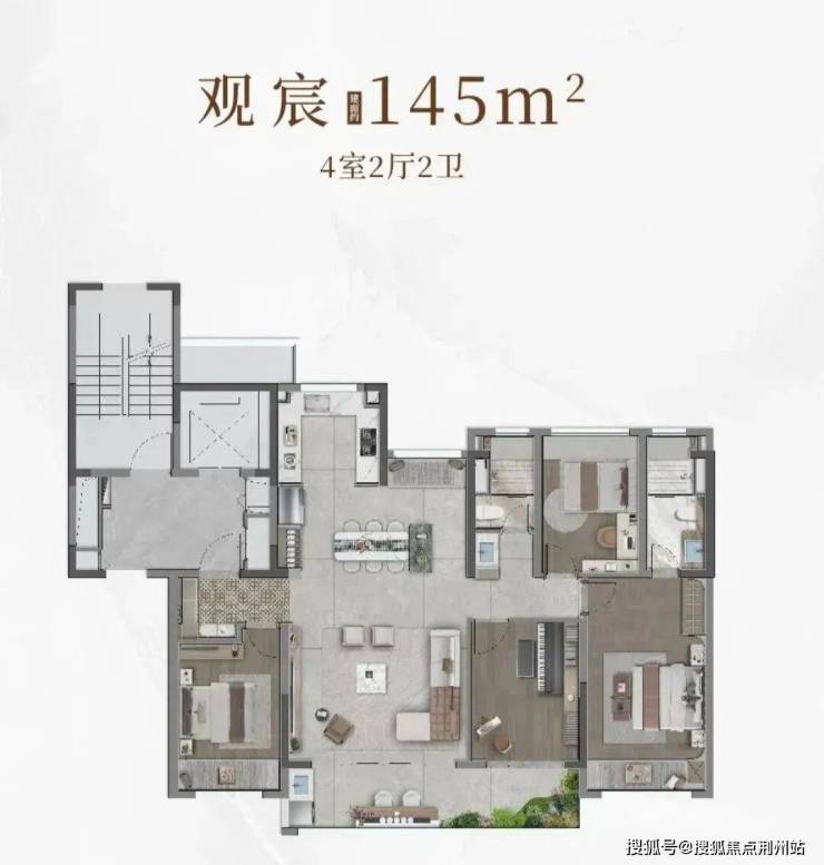 整个建面约145㎡4房2厅2卫的户型布局做到了大客厅、大开间、大卧室和大厨房空间。约145㎡户型,更是拥有南向四开间+面宽约14.5米。