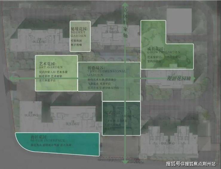 设计灵感源自新加坡艾迪逊酒店与《天空之城》“漂浮的拉普达”,以 “双轴五园” 为架构,打造约108米南北立体归家轴、约90米东西漫享花园轴,串联仪式花园、下沉庭院、儿童乐园、秘境花园、艺术花园五大花园;