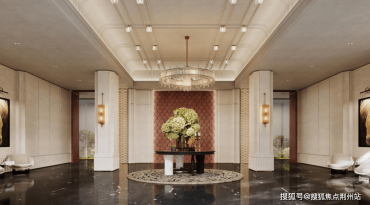 走进大堂与电梯厅,统一的色调与气质也得到了延续。首层大堂中,不仅还会出现独立的下沉庭院,还会有供业主使用的私享会客厅。同样也是奢牌酒店级装标,从不同石材的复合利用,到层高的充分利用,还有弧线设计元素的贯通……设计与施工难度上不断抬升,才有了无出其右的空间效果。