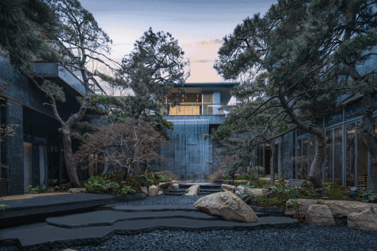 运河水岸的平墅群落,被赋予极光霞银的流动气质,建筑形态从运河的曲水流光中捕捉动态曲线,以银色铝板与纤细金属型材,搭配大面积通透玻璃,模糊室内外界限,使得建筑在不同光线与天气下,持续与天空、运河水影进行着变幻的视觉对话,借运河水、人文情、自然景,营造出一首凝固的流体诗。