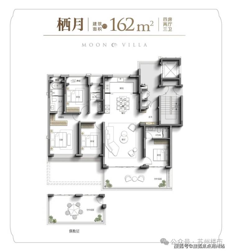建面约162-164㎡四代洋房,以奇偶错层布局,为每户呈现全南向约21-22㎡空中露台,将庭院向上生长。