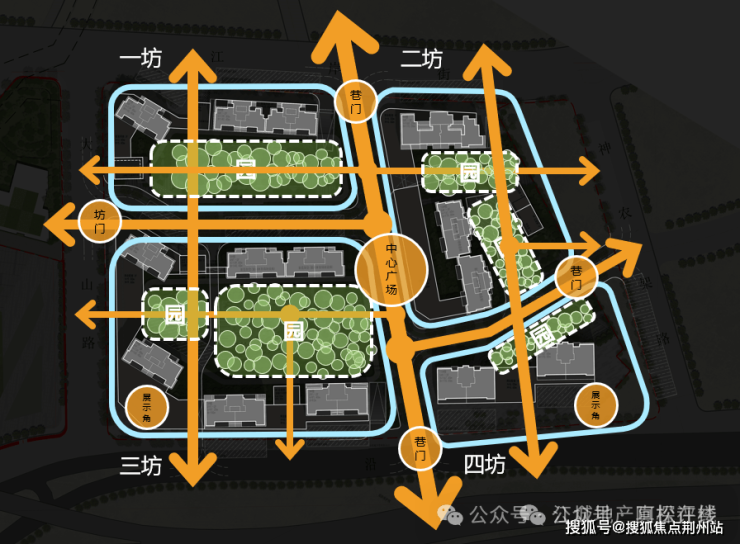 项目住宅参考整个二七滨江商务区及江岸区汉口历史文化风貌区的规划特点,整体规划为“四坊六园”,通过立体化的空间串联与功能复合,有效整合地块资源,融入老汉口片区特点,打造有温度、有记忆的城市空间,实现人居生态环境。