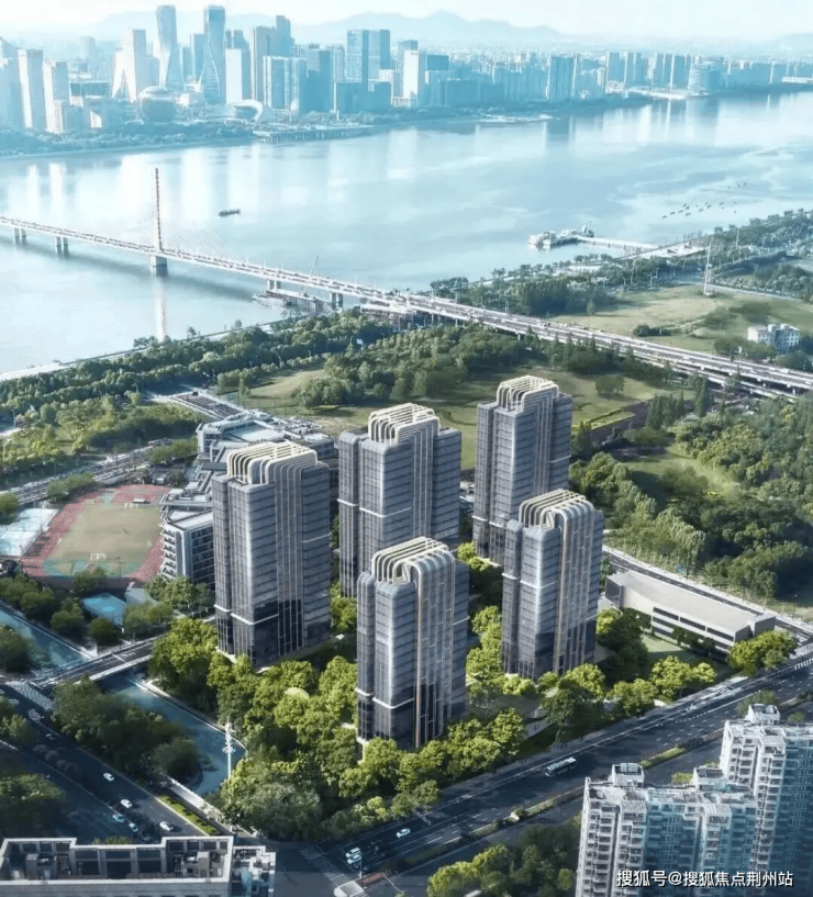 在航拍视角可以看到,望天际的楼幢在地块中呈现微微倾斜的排布,这样才能正向面对江景。