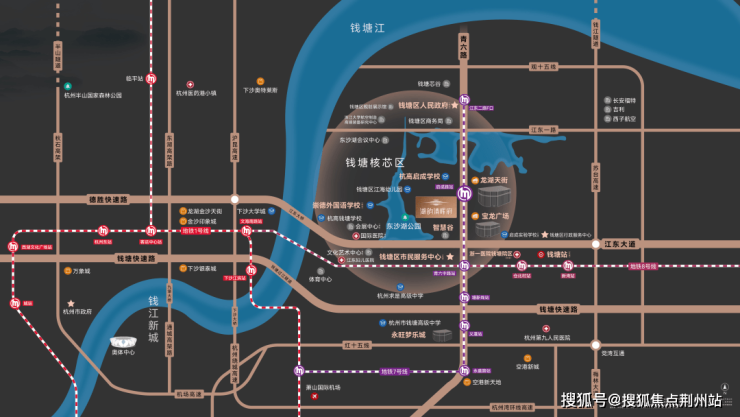 除了景观,在湖韵清晖府的东侧,出门就是龙湖江东天街;往北走约150米,就是地铁7号线启成路站,无缝对接杭州的城市脉络;往南走约500米,是宝龙广场,整个江海之城,最为核芯的商业体,几乎都集中在了湖韵清晖府的周边。