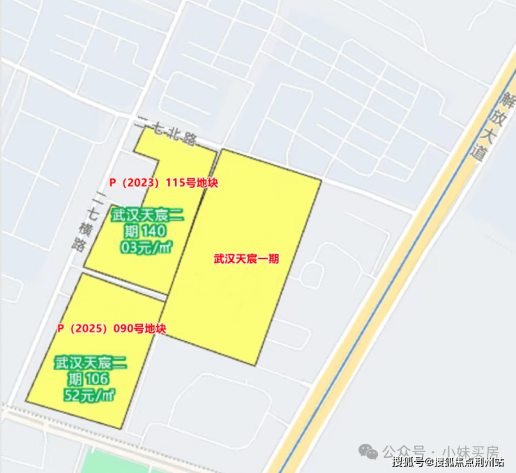 武汉天宸二期由P(2023)115号地块和P(2025)090号地块组成,其中P(2025)090号地块是武汉地铁在今年9月25日的土拍中拿下的,成交楼面价10652元/㎡,P(2023)115号地块是武汉地铁在2023年12月底拿下的,成交楼面价为14003.6元/㎡,两个地块共同组成了二期。