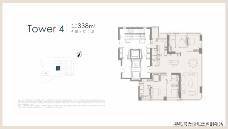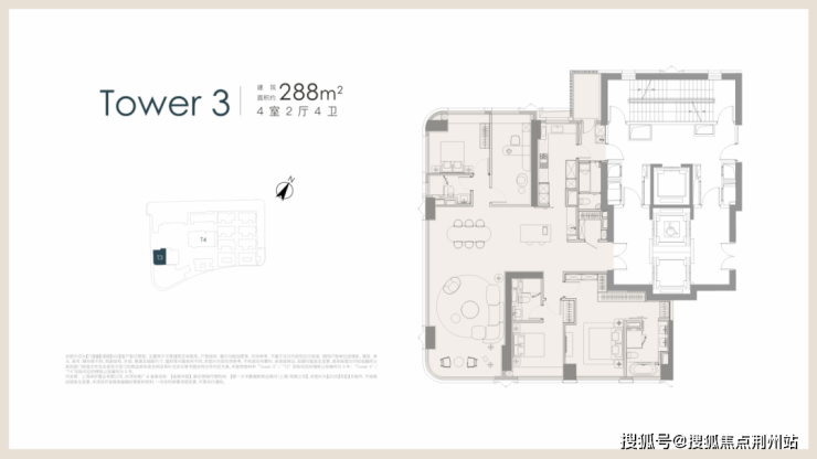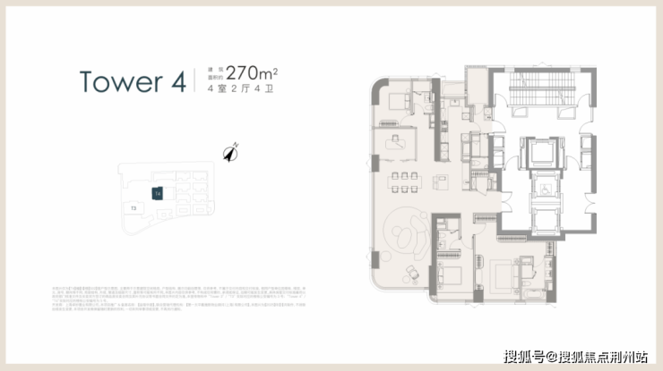 项目起步建面约270㎡3+1房户型,位于T4栋西边套。同样拥有独立的后勤动线及电梯厅的设计;+1房的空间未来可作为书房/茶室/衣帽间使用。