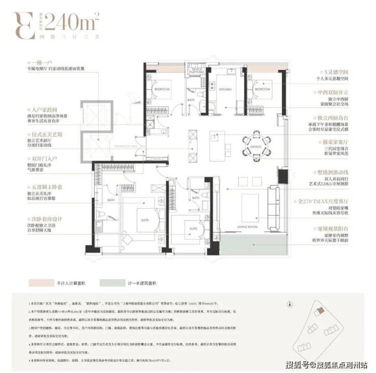 建面约240㎡四房三厅三卫,由国际知名室内设计师吴滨执笔,以厨电、收纳、家政、智能、幕墙、定制“六大满配”,实现了从空间功能、材质美学到身心体验的全维革新: