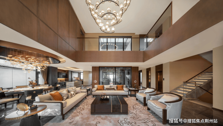 约600㎡前庭水苑,休憩平台与室内空间联通,于山水相依之间观四时之景;行走于山水曲廊,抬头望去是定制古铜金格栅“华盖”,气势恢宏铺陈归家之路。