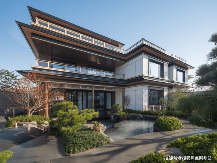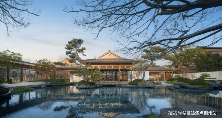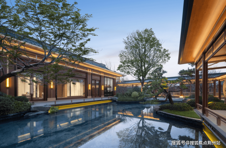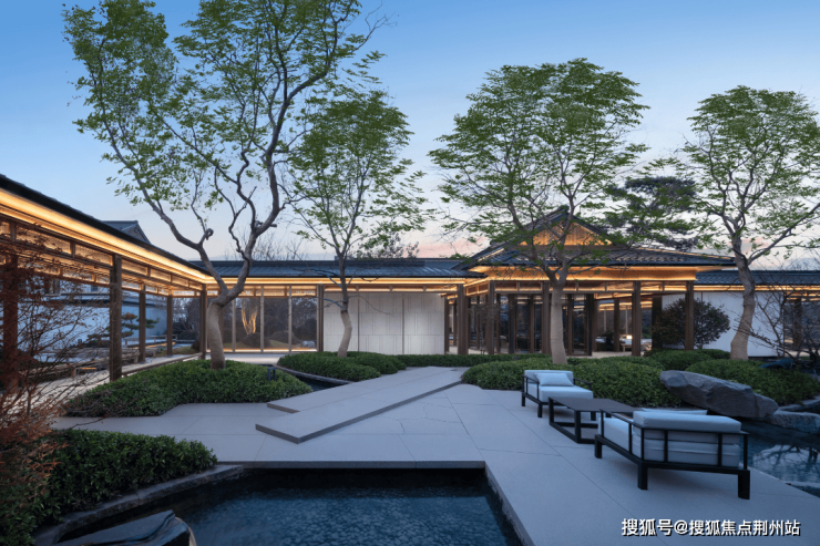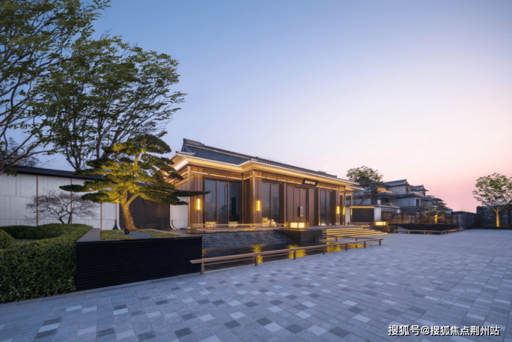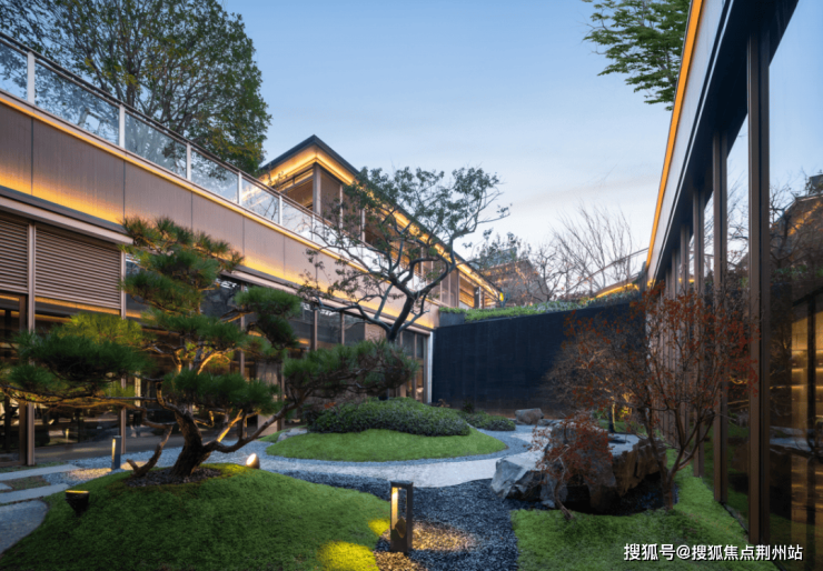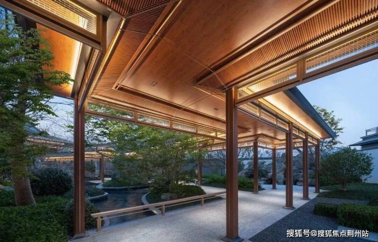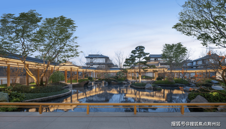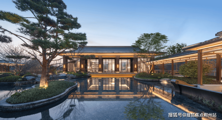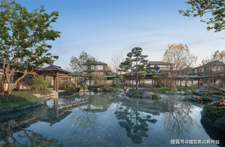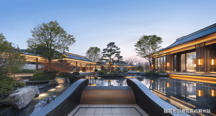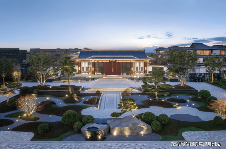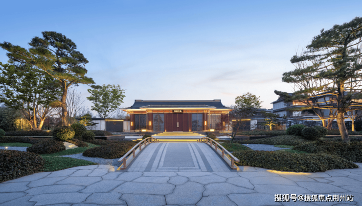 约3200㎡超尺度入口仪式广场,将奢宅巨筑的气场拉满;象征高升之意的状元桥横跨其间,两侧苍翠松木掩映,禅意枯山水夹道,创造出启东罕见的宋韵尊崇仪序。
