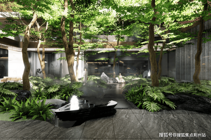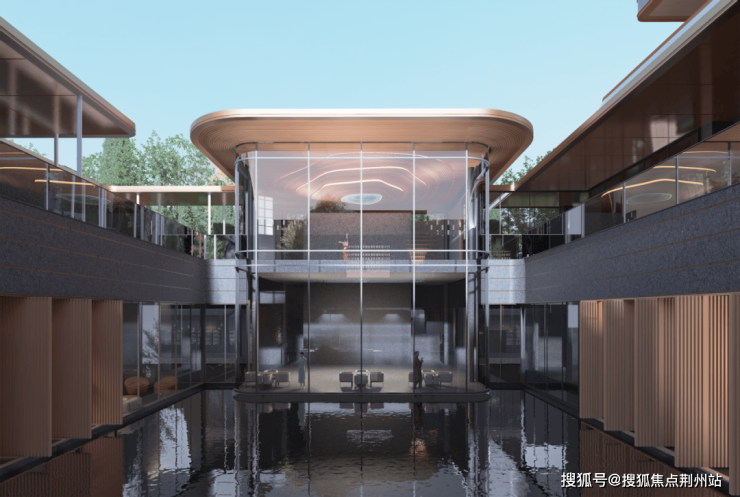 住区景观以浮岛度假泳池围合中央空间,将五重植被景观递进串联,人文活力主题架空层与泳池上方的光岛图书馆遥相对望,集合阅览、休息、嬉水娱乐、养生为一体的第二生活活力空间,容纳生活的百般志趣。