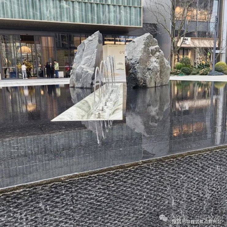 这里是小区的主入口,主大门上有一面标志性的冰蓝玉石幕墙,入口界面打造了宽约85米、进深30米,落差近2米的叠水景观,中间一块重达50吨的被水流分割成两半的“中国黑”原石,下面是由香格里拉翡翠玉石铺就的玉道,名为“双生、涌玉”寓意“精诚所至、金石为开”。