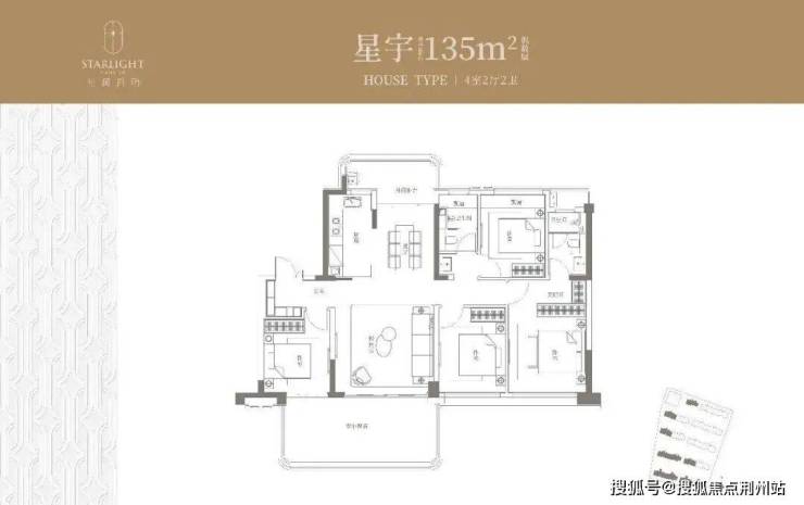 先看建面约135㎡(偶数层),做到了4房2卫+4开间朝南,南北双阳台,主卧大套房,具备改善型四房应有的一切优点。