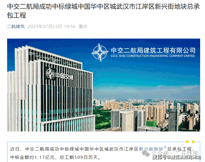 7月23日,二航建筑发布推文,宣布中标绿城中国华中区城武汉市江岸区新兴街地块总承包工程,总工期509日历天。