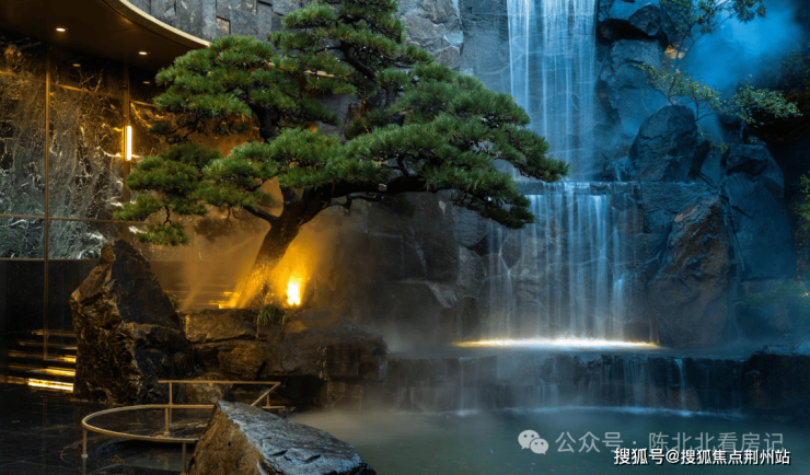 园区内规划了 7 米高的飞瀑景观,搭配近 300 年树龄的名贵黑松,观感十分耐看。