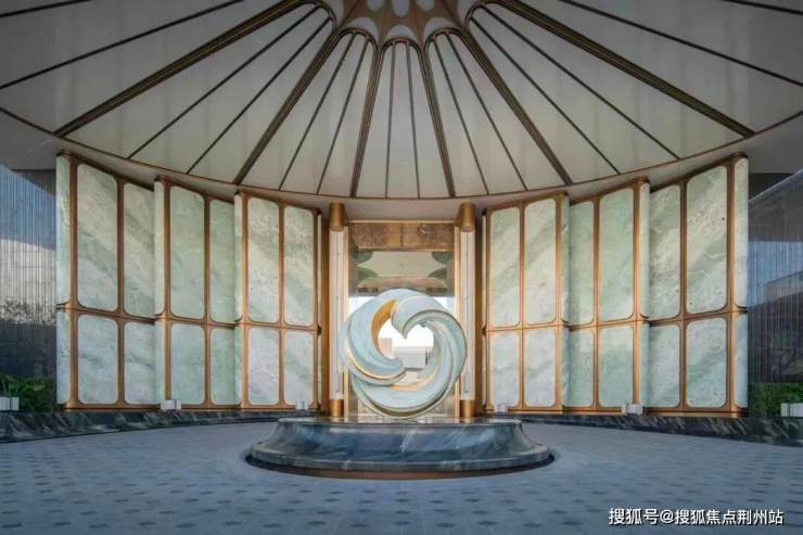 门前矗立“玉镜流光”雕塑,整个门庭犹如一幅江南画卷,既雅致又贵气!走进大堂,八根巨幅立柱还原了伞骨的形状,细节处还有汝窑冰裂纹的陶片镶嵌,地面拼花运用了江南花窗元素……