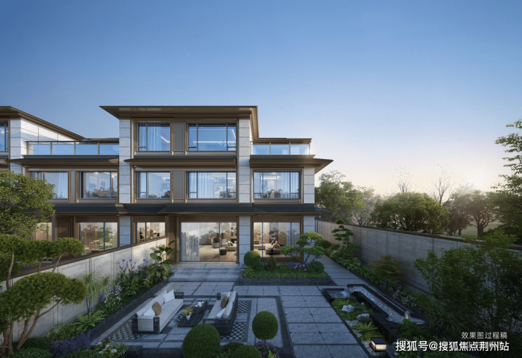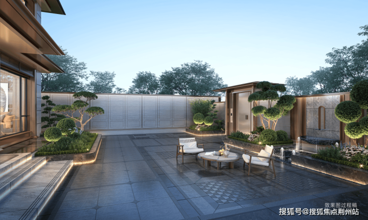 宋风美学,归家即度假:约32米宽的归家大门,60吨太行山老石皮与日本进口罗汉松相映,奠定了隐奢的基调。