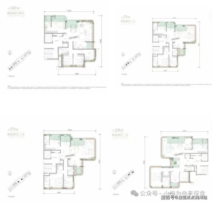该项目的外立面,是公建化外立面,做了香槟金色的弧形线条,采用了大全景玻璃,颜值也是很高。从效果图来看,预计是封窗交付。该项目小梅了解到该户型面积段主要包含3个,140㎡、171㎡以及201㎡左右,其中主力户型是170㎡左右。户型图如下