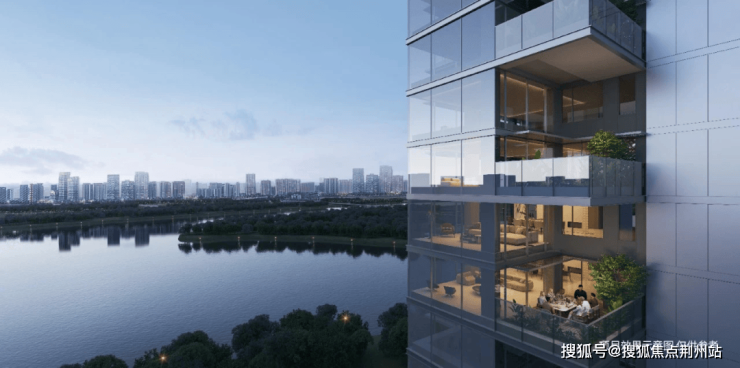 同时,项目汲取江河鎏金色彩,通过大面积落地玻璃,并辅以涂料和部分石材、铝板、型材,呈现一种“天空之镜”般的简洁立面,让无界江景倒映成生活的画框。