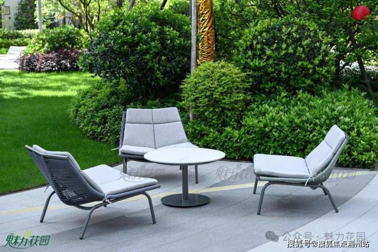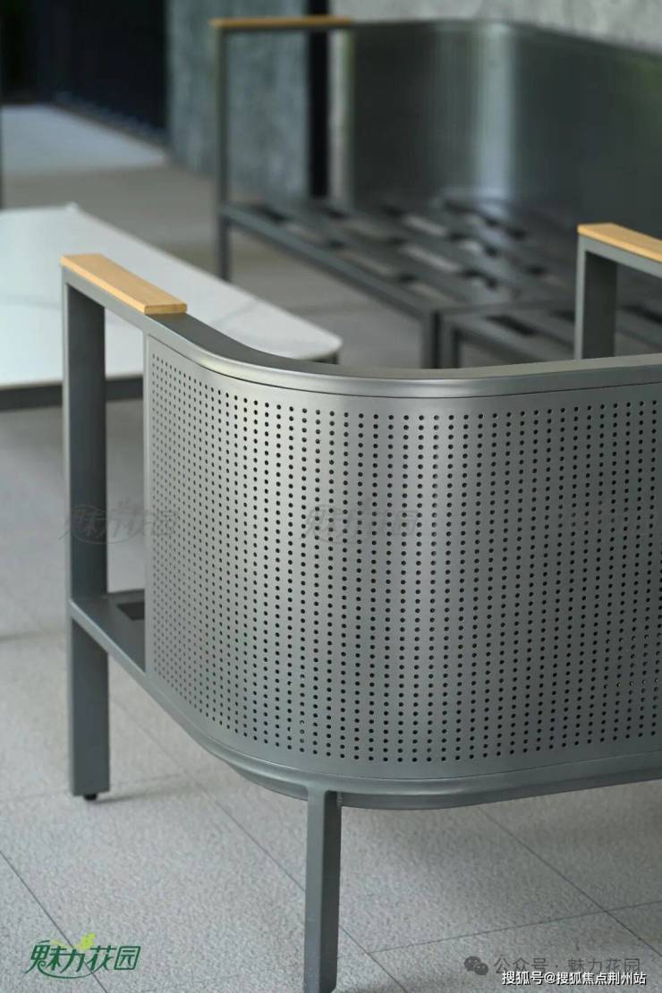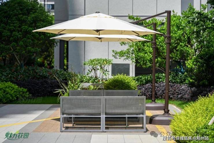 简约的灰色金属座椅五件套,搭配时尚的遮阳伞,方便来往的人们歇息片刻