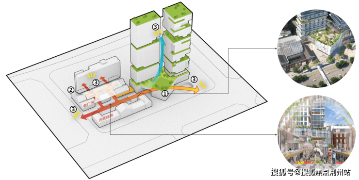 3.生态、时尚、创意“向空中自然生长”,以立体生态花园的姿态呼应“山水园林城市”。