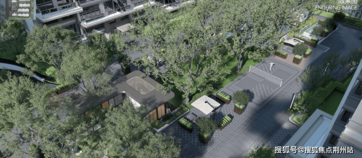 借景古塘河,为业主打造约2600㎡水岸公园,含水杉树阵、绿地草坪、400米跑道及健身设施等