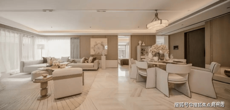 约14.8-15.55米面宽,大横厅设计,整个空间可达约43平,空间十分阔绰,打破传统墙柱结构,客厅、餐厅、阳台贯通形成“全面屏”空间,不仅意味着视觉上的通透与大气,更赋予了布局上的自由,回应了改善客群对“生长型住宅”的期待。