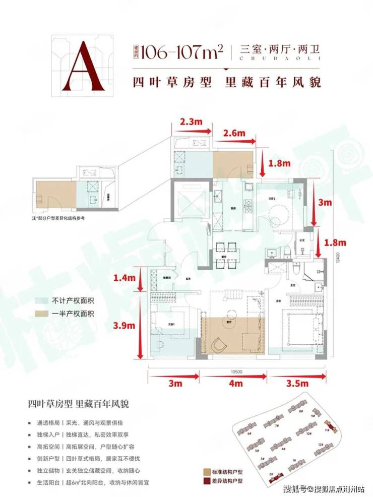 106-107平三房两厅两卫户型,实际套内得房率在89%左右: