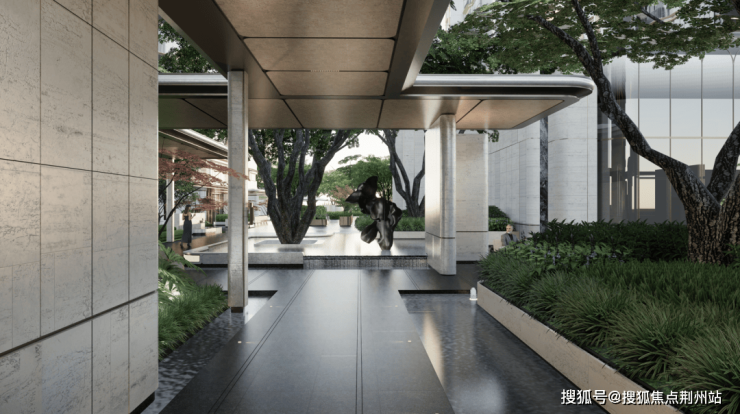 在门庭外,辅以两侧具有仪式感的跳泉水景,将建筑的圆弧美感与自然水景相合,共同构成海上·清和玺“贵雅清和”的城市界面。