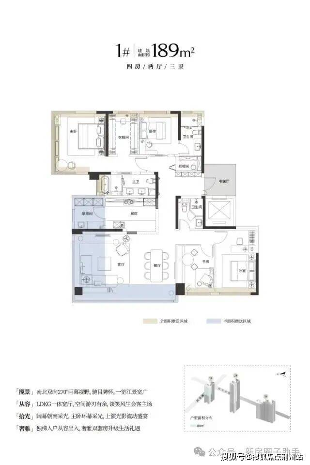 该户型为1号楼16-28层西边户,在153户型基础上增加了西侧家政间和北侧卫生间等面积,高区和低区做成了不一样户型。主卧做到了三面全景落地窗,客厅也有西南向270度的景观视野。该户型是本项目的王炸户型,即可以保证采光,也有不错的江景。