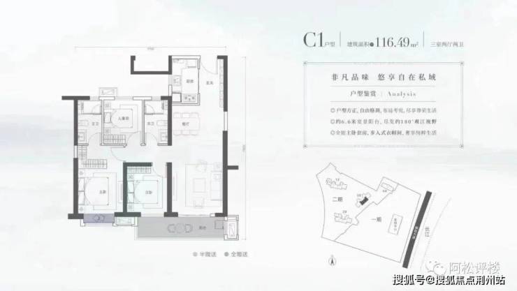 1、2号楼的中间户,三开间朝南,户型方正,北侧对着连廊,依靠连廊有通透性,但北侧房的采光和私密性较差,南向阳台比较大,主卧和次卧朝南,主卧带独立卫生间。