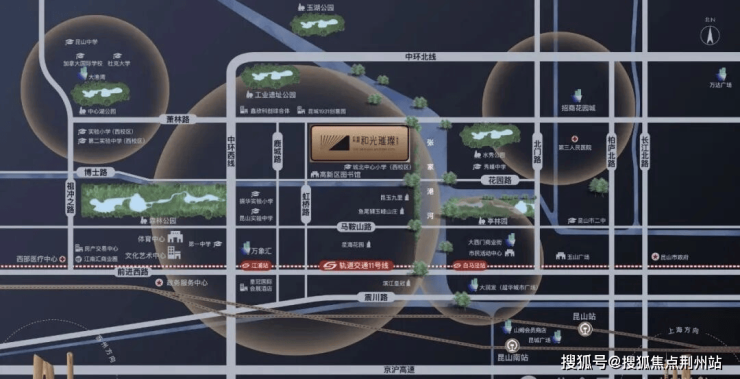 和光璀璨位于昆山市玉山镇,该项目由招商和保利两家央企联合打造,项目以园林水乡为概念,离尘不离城,打造昆山城西首个定制五重仪制空间,以两轴、一环、八园的景观结构,塑造酒店般尊贵归家体验,真正的做到“出则绿意融融,入则静谧独享”,打造了一个“公园+住宅”的现代居住模式。此外项目采用了人车分流模式管理,地上行人、地下行车,保障业主出入的安全。