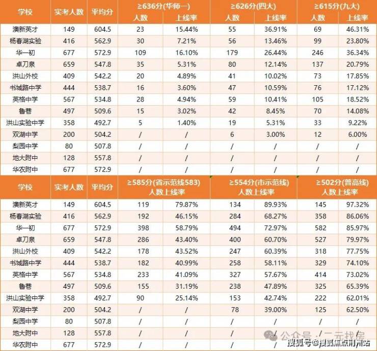 第二梯队(普高率70%+,示范率60%+):卓刀泉中学、洪山实验外校、书城路中学、英格中学
