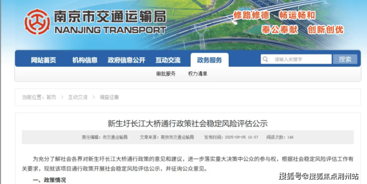此前,9月5日,南京市交通运输局官方发布《新生圩长江大桥通行政策社会稳定风险评估公示》