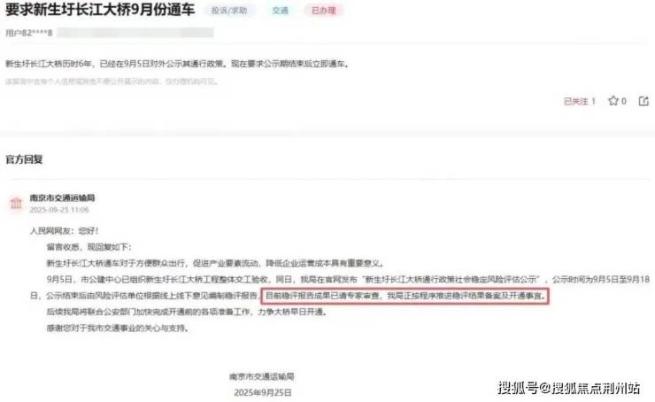 近日,南京交通运输局回复:仙新路过江通道目前稳评报告成果已请专家审查,我局正按程序推进稳评结果备案及开通事宜。后续我局将联合公安部门加快完成开通前的各项准备工作,力争大桥早日开通
