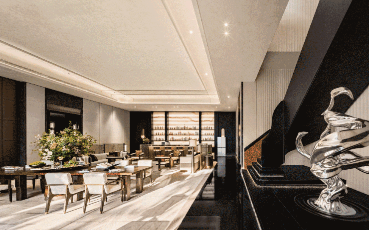 穿过约58米威仪的景观大门,遵循传统车马院灵感打造的环岛式落客区,瞬间将城市的喧嚣隔绝于外,归家的仪式感与尊崇感油然而生。