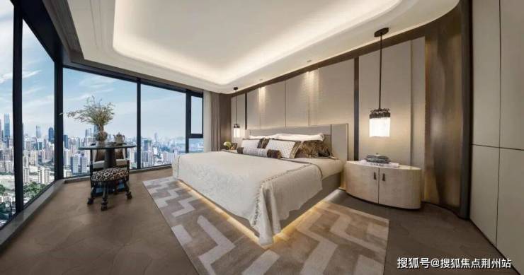 户型开窗率超70%,做到“采光平权”的全景舱。从客厅到卧室,均为落地窗,俯瞰中央庭院,尤其边户的主卧套房,畅享270°转角的观景面。