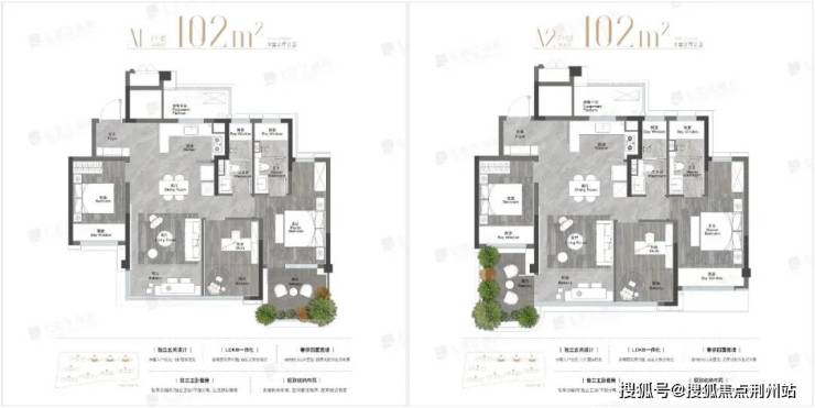 户型102㎡三房起步,户户有露台,空间利用率超100%