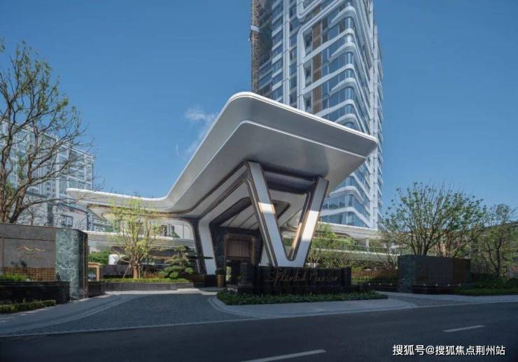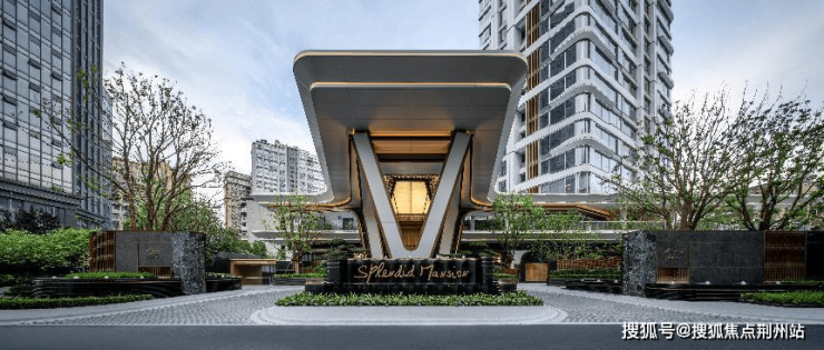 万科锦绣湖山的V字门头气势恢宏而华丽,在汉口高雄路上,特别令人瞩目。其宽约26米、高约9米,双曲面设计的独特V字造型,作为标志性的符号红遍汉城,成为汉口豪宅的“第一眼”。