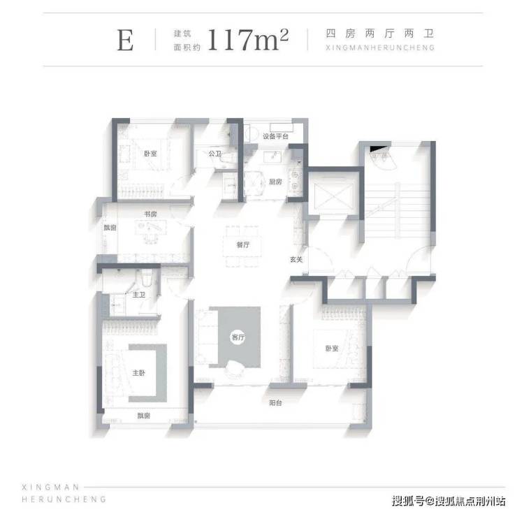 约117㎡户型点评:全明方正通透, 提升空间利用率,LDKB一体,营造大尺度餐客双厅, 亲朋从容相聚,双开间观景阳台, 晾晒之余, 亦可成为兴趣天地,四房功能, 让家庭成长的理想一步到位