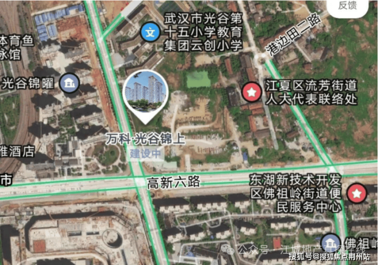 北侧为光谷第十五小学教育集团云创小学;南侧正对高新六路、佛祖岭还建房、伟星星悦广场;西侧为流芳路、万科光谷锦耀等;东侧为私房和单位房产。