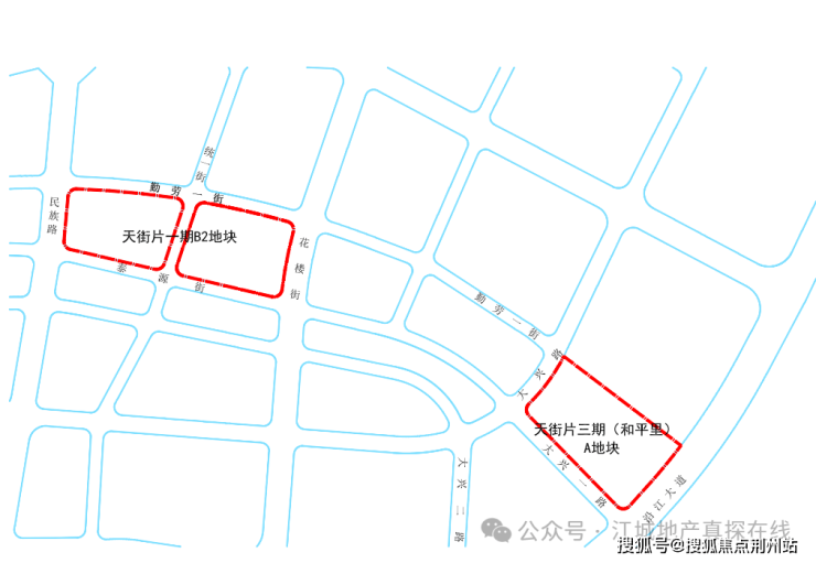 前期开发的武汉江城府就是天街片一期的B1地块,B2地块原本是位于规划市政道路勤劳一街以南的两个商业地块。