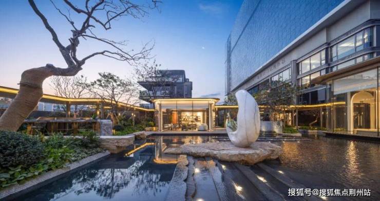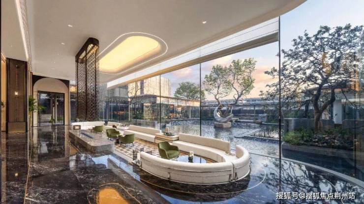步入三进的入户大堂,直面园区中轴景观「临水观澜」:
