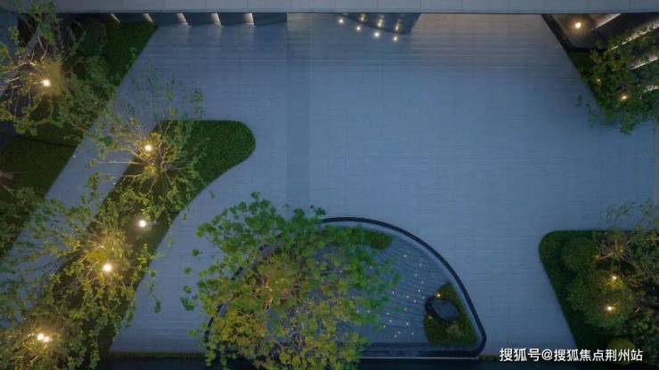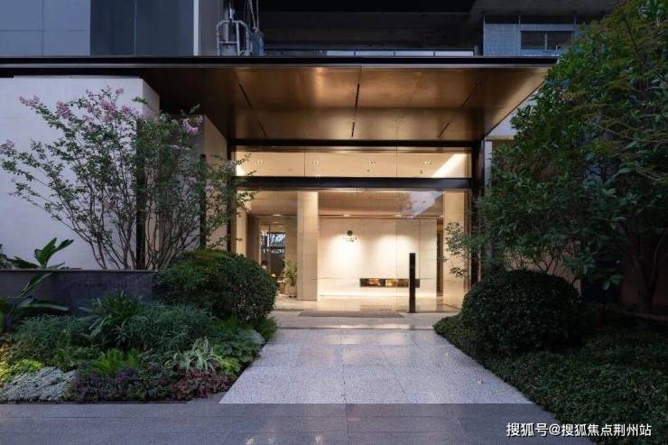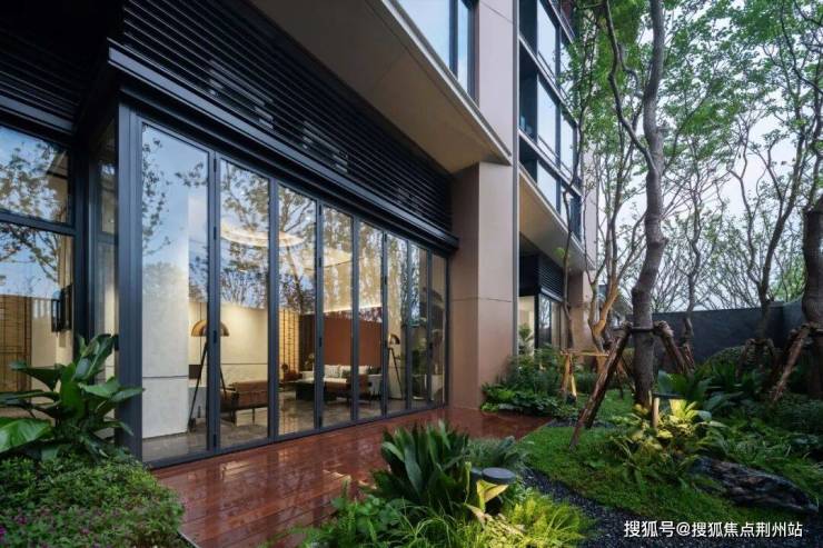 架空层以温润诗意的东方格调渗透与室内外空间,尽显宁静舒适且稳重的雅韵。室外雅致、自然的植物组团实现了景观、建筑及室内之间的联动,让人躁动的心在不知不觉中趋于沉静。