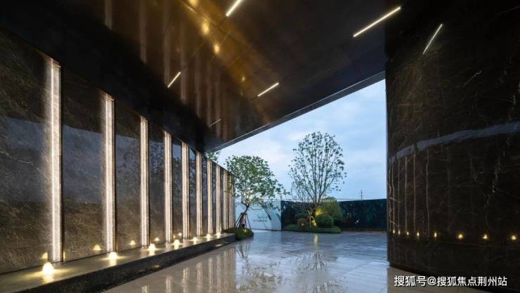 强调品质与细节的前场景观揭开了归家序幕。迎宾涌泉在水面泛起涟漪微波,温德姆灰大理石景墙与精致品牌案名在材质质感、肌理等方面形成多重对比,共同构成一幅相得益彰且有张力的归家画卷。温德姆灰大理石搭配极具质感的仿铜色造型铝板肌理,结合暖黄色灯光流泻,充分彰显精奢雅致的归家礼序,营造定制化的归家场景。