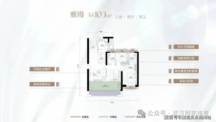 中间户建面103㎡,通过花池+飘窗的赠送,整体赠送面积18.87平,得房率超过90%,和客厅联通的X空间,可以做书房、茶室等空间,他的空间观感甚至可以比你看传统超高层120平要更大