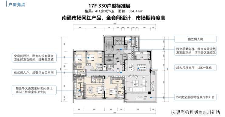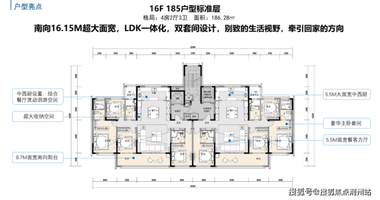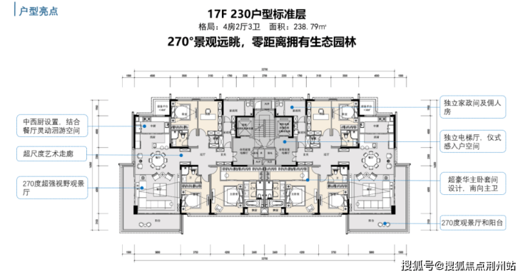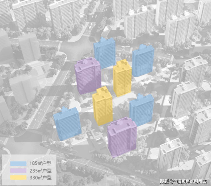 8幢住宅楼分别由4栋16F及4栋17F的小高层建筑组成,主力户型为一梯两户的185㎡、230㎡的全豪华4房以及一梯一户的330㎡全套间超豪华4房三种,满足不同人群如二代、三代同堂家庭等多样居住高品质需求;185㎡及330㎡的顶部复式户型更提升了更高品质的居住需求。户型多采用大面宽横厅,转角方厅,餐厨一体化的设计引景入室,增加居住舒适度和户型社交性。