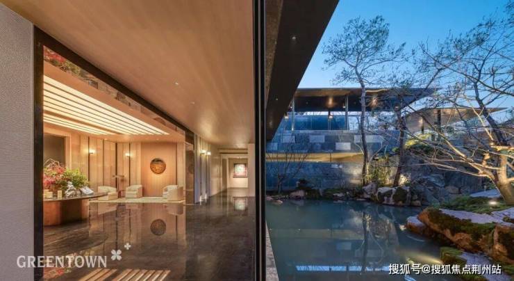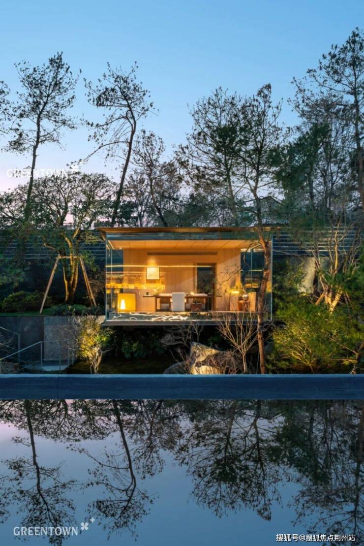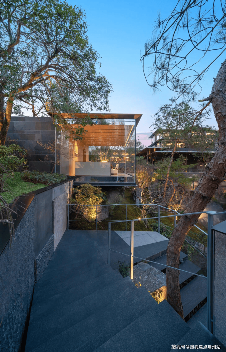 步入泛会所,眼前是一幅由整幅大玻璃窗映照的自然画卷,外侧曲水流觞,自然之美尽收眼底,而室内则透露着隐奢生活的气息,这种对比营造出一种强烈的视觉冲击和美感。尤其是负一层的书吧,一侧是气势磅礴的飞瀑,正对面则是一个悬空的玻璃茶亭,四周环绕着各种挺拔的乔木,眼前一池春水缓缓流向峡谷。这里汇聚了10余种枫树,百年古桂,更有150年历史的日本鸡爪槭。连峡谷之上的桥梁都采用未经雕琢的老榆木原木,辅以冬青的点缀,仿佛将人带入西湖深处的一处幽静秘境。