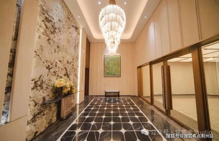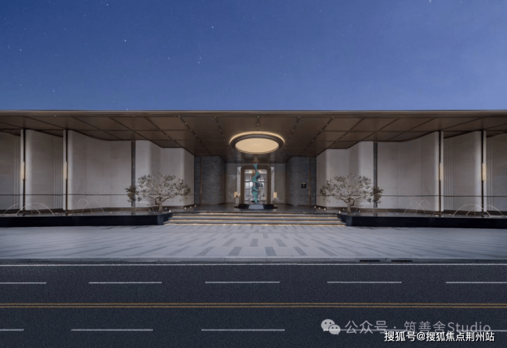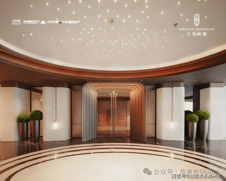 天誉原墅在社区入口的设计上,展现了极高的审美与气度。项目打造了长达约54米的恢弘门厅,搭配约6.5米的挑高门廊,以“立体、奢阔、无界”的格局,构筑起磅礴大气的第一视觉印象。两侧臻选金米黄石材与库班绿石材拼接,肌理细腻、质感厚重,搭配利落的金属线条勾勒轮廓,没有多余装饰,却在细节处尽显国企精工底蕴。入口处艺术水景与名贵乔木掩映,潺潺流水与温润石材相映成趣,藏风聚气,消解城市喧嚣,营造出“一步一礼序,一景一尊崇”的归家意境。